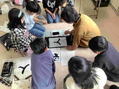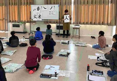 11月21日、地域ボランティアの金子さんにお越しいただき、習字の学習で「人」という漢字の書き方を教えていただきました。初めての「左払い」と「右払い」に苦戦する様子も見られましたが、金子さんに細かいところまで見ていただいたり、たくさん褒めていただいたりして素敵な作品を仕上げることができました。