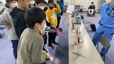 見学後は、班ごとに手回し発電機や模型を使い、電気が生まれる仕組みを体験する実験を行いました。