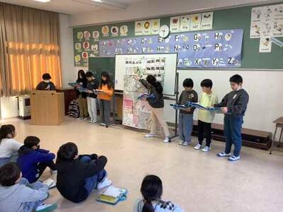 4年生は学習発表会で「ごんぎつね」の劇をします。児童たちは、人物の気持ちを表すために、どんな動きがいいか、どんな音を鳴らすか、どんなものを使うかなど様々なことを考えています。普段の学習の成果を表現できるよう、日々の練習をがんばりたいです。