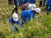 5月の田植え体験から4か月。本日5年生は黄金色の田んぼで稲刈り体験を行うことができました。最初は鎌の使い方など、ぎこちなかった子供たちも、佐藤さんをはじめとしたボランティアの皆さんのアドバイスを受けて手際よく刈り取れるようになりました。10株以上刈り取った子供もいたようです。普段給食や食卓に並ぶごはんのありがたみをより実感した様子でした。