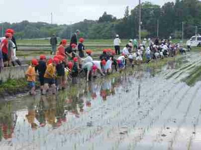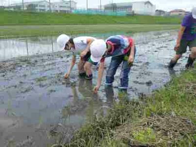 今回はひとめぼれの苗を植えました。子供たちは口々に「苗を植えるのが難しい。」「手作業での田植えは大変。」「足が抜けなくて困った。」と経験したからこそ分かる感想を話し、お米作りの大変さを実感していました。そして、これからの苗の生長を願い、秋の収穫を楽しみしています。