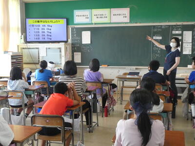 7月18日(火)給食センターの伊丹先生から,汐見小学校の残食の実態の話を聞き,全員で「食品ロスを減らすには,自分には何ができるのか」について考えました。