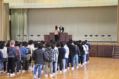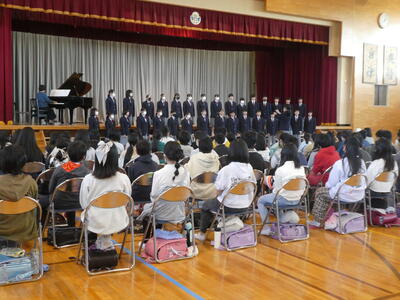 5・6年生が向洋中学校で行われた「中学生の合唱を聴く会」に参加しました。各学年の合唱を2曲ずつ聴かせていただきました。学級全員の気持ちが1つになった合唱を聴き、子供たちはみんなで歌う良さ、美しさを感じることができました。向洋中学校の皆さんありがとうございました。