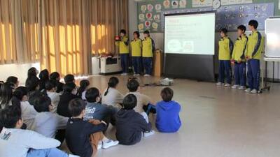 11月7日に、向洋中学校から職場体験で訪れた生徒が6年生を対象に「学校紹介」を行ってくれました。以前のオープンスクールで聞けなかった学習や部活動のことを質問し、中学校への期待を含まらせていました。