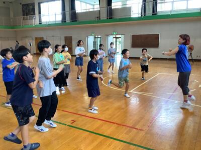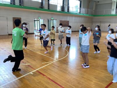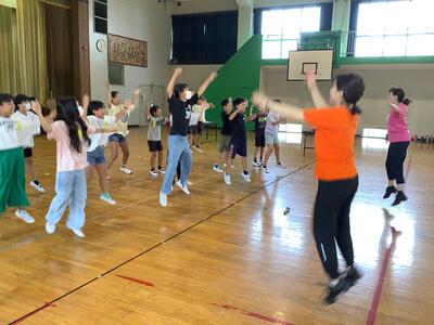 さて、本日は10月1日の芸術鑑賞会「ルドルフとイッパイアッテナ」の事前ワークショップが行われました。その劇中にキャストとして出演するため、劇団から5名の講師をお招きしてダンスと歌の稽古を行いました。ダンスはノラ猫になりすまして踊ります。キャンプファイヤーの盛り上がりが続いているかのように、全員が楽しく参加することができました。